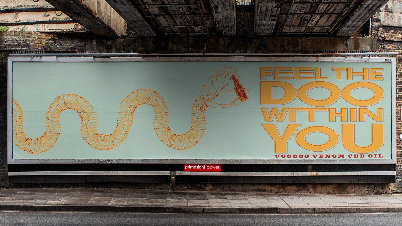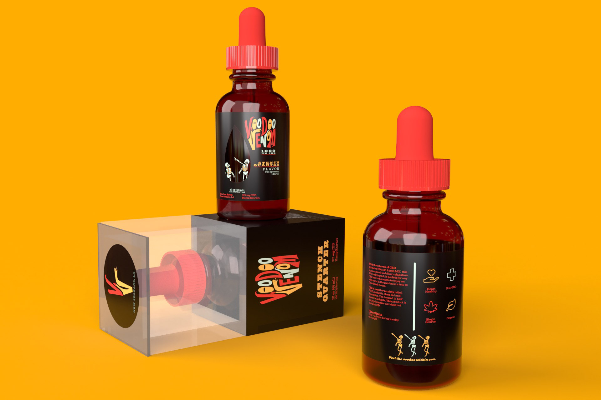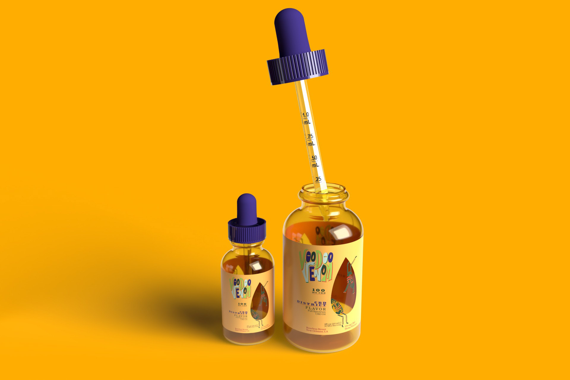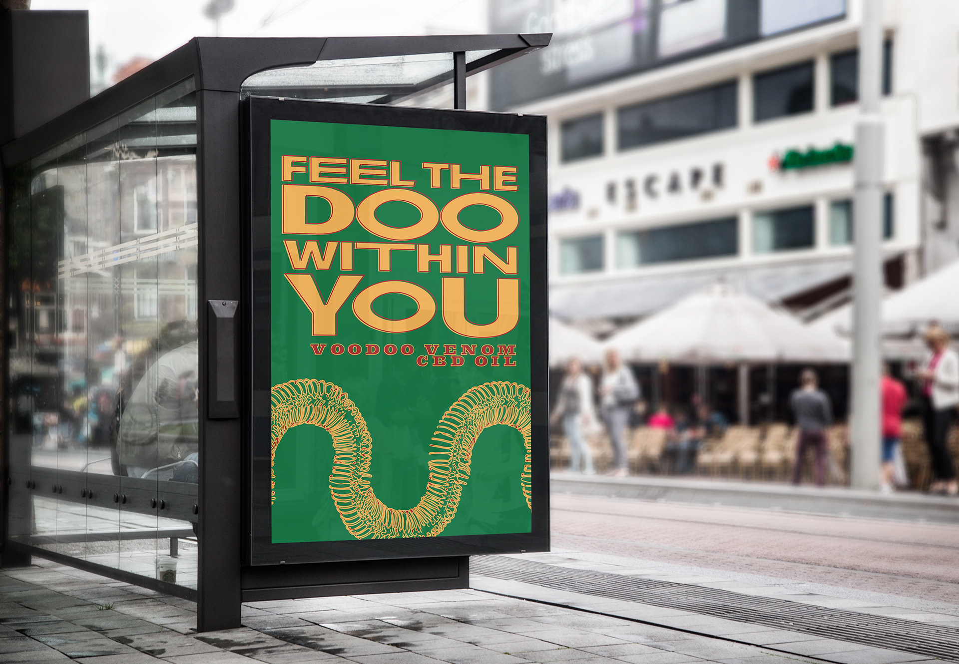 Voodoo Venom is a start-up company in the middle of downtown New Orleans, Louisiana. With heavy influence from the Creole culture, Voodoo Venom operates as a full- fledged CBD oil store where travelers and locals enjoy different flavors and creations derived from THC. Voodoo Venom’s goal is to normalize CBD oil usage for everyone and make packaging that reflects the New Orleans voodoo roots. 3D renderings of bottles and boxes for the CBD Oil were made in Adobe Dimension. All copy and creation of the box contraption was in house by yours truly utilizing Sutro Deluxe and Sutro Bold as typefaces. An ad campaign created in part with the branding and packaging was also made to engage new audiences and get the face of Voodoo Venom out on the street. Thus, “Feel the doo within you” was born.