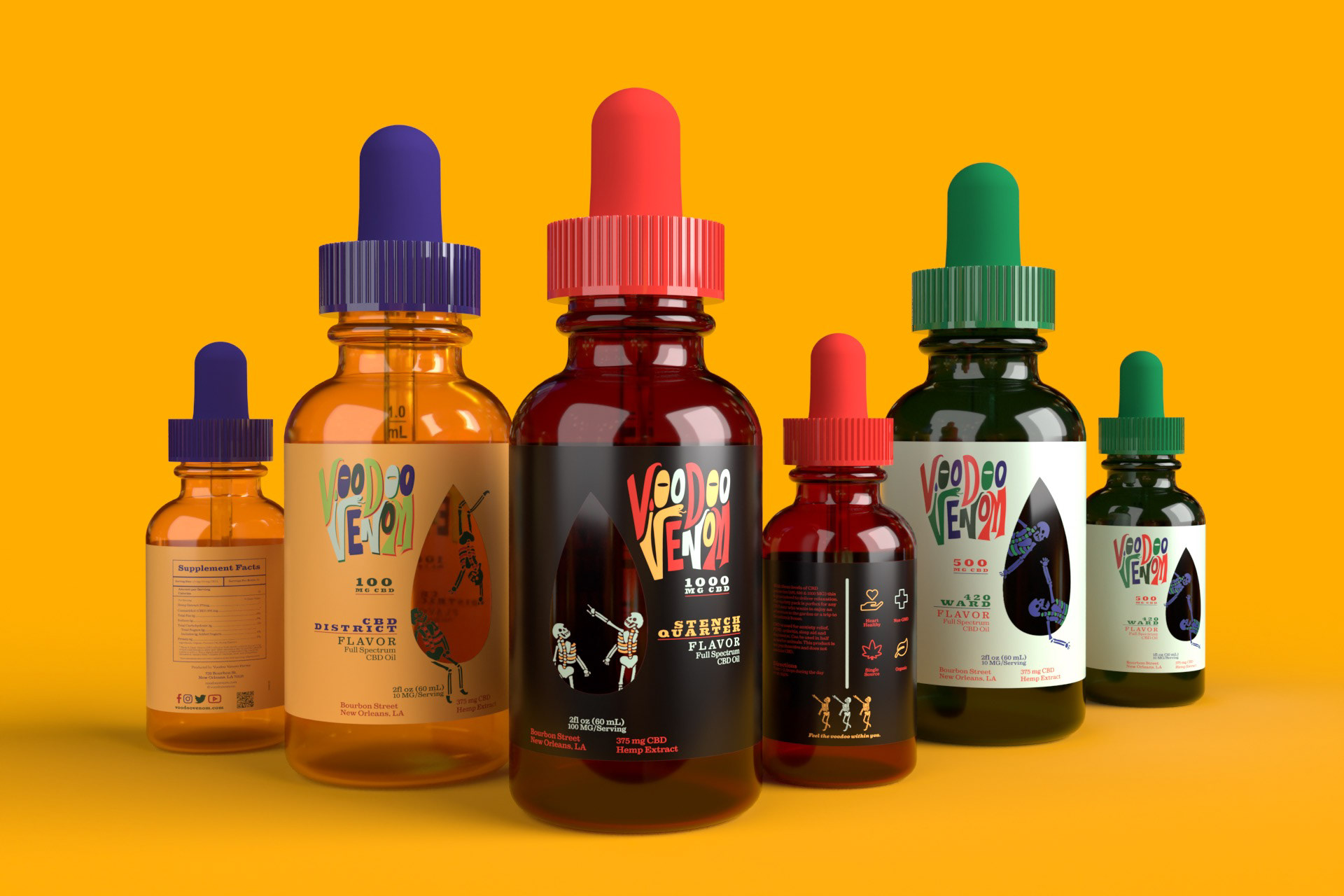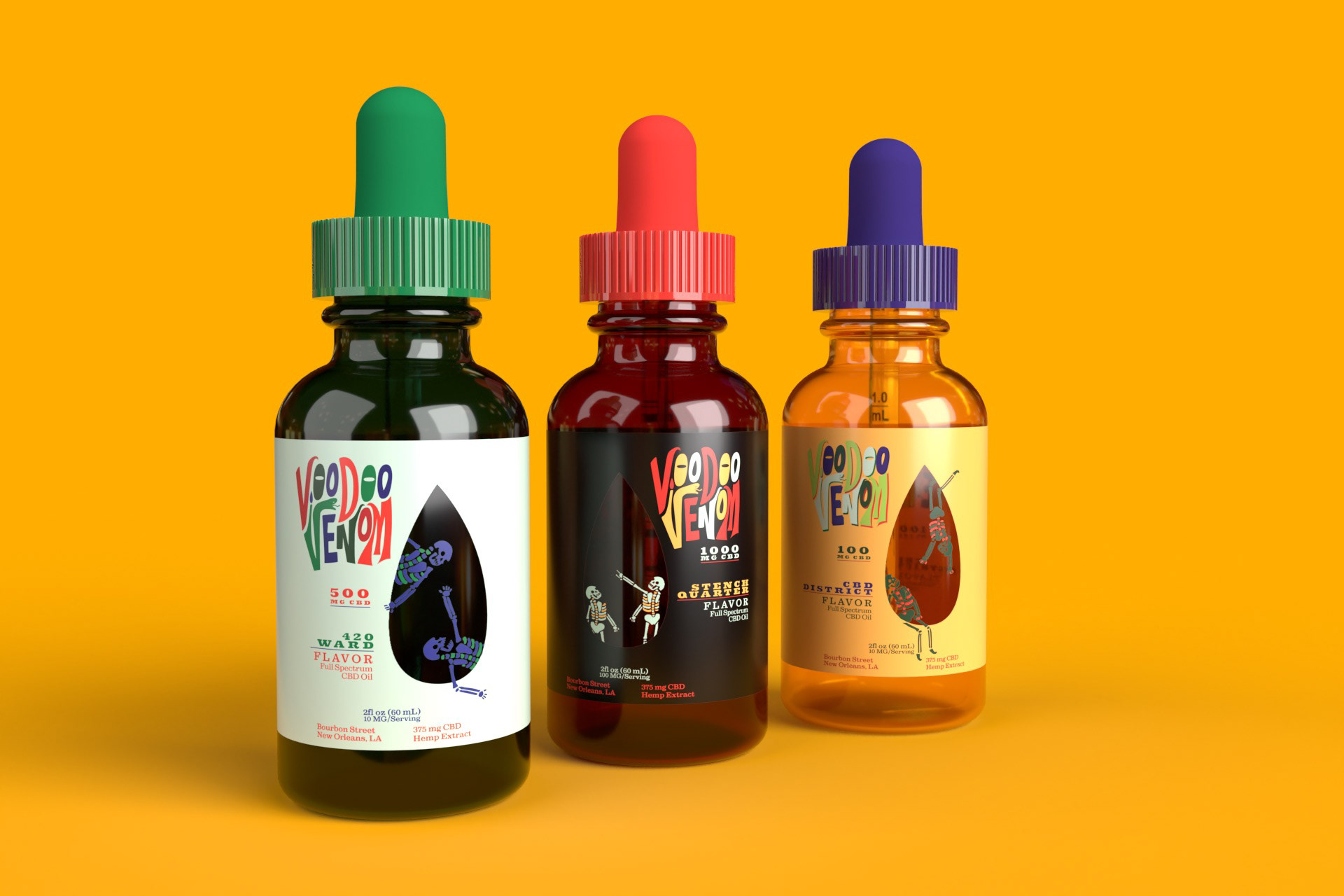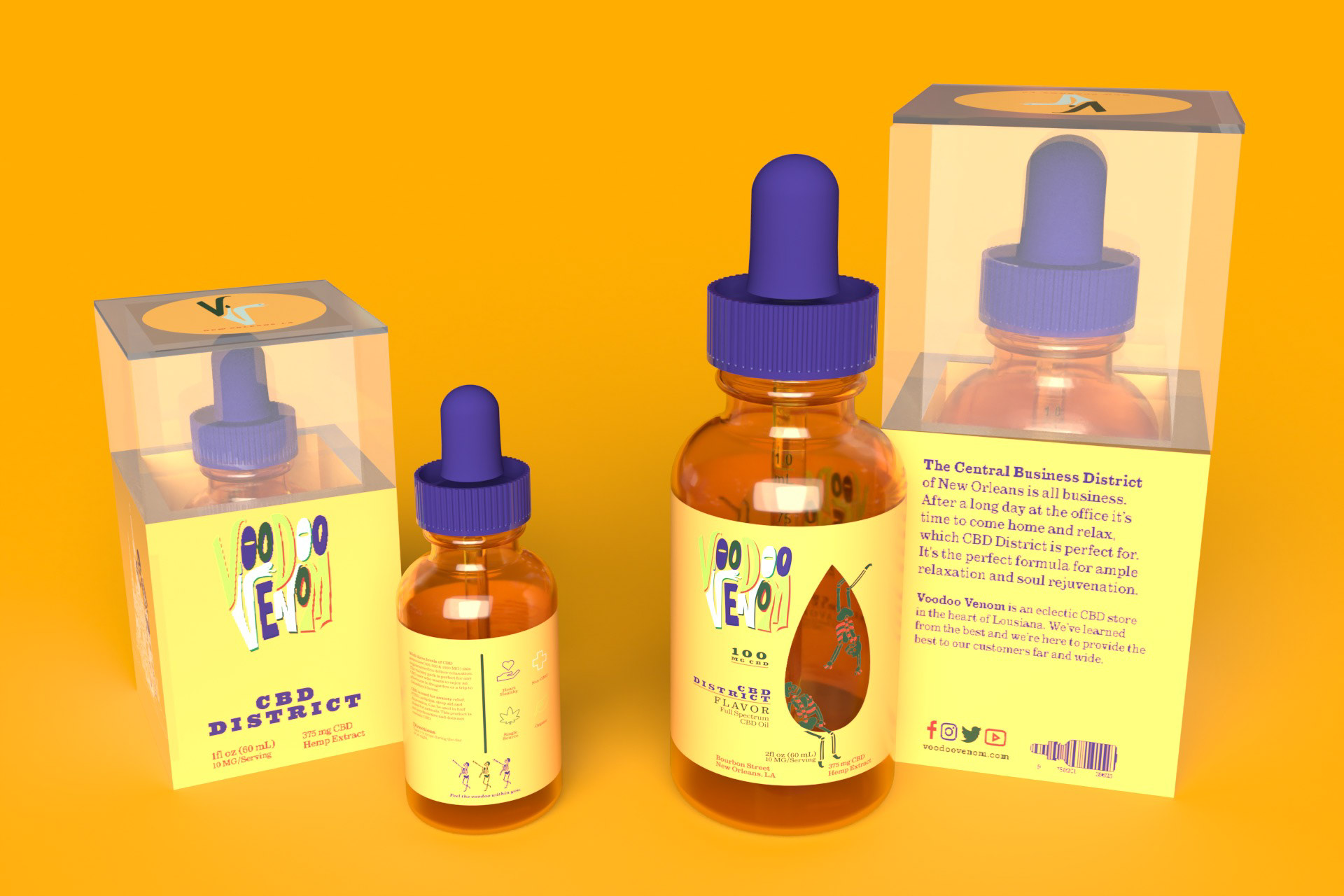 I choose to do CBD Oil because it’s currently all the rage, but a lot of the packaging I’ve seen is awful. Too many cannabis leaves and not enough structure. I knew I wasn’t going to go about the packaging process in a traditional way. I mostly wanted to do CBD Oil because I wanted to try CBD myself, but needed to convince my parents. So instead of being a delinquent, I used it as field work! I made this brand as fluid as possible by making it based out of New Orleans and I began to research.